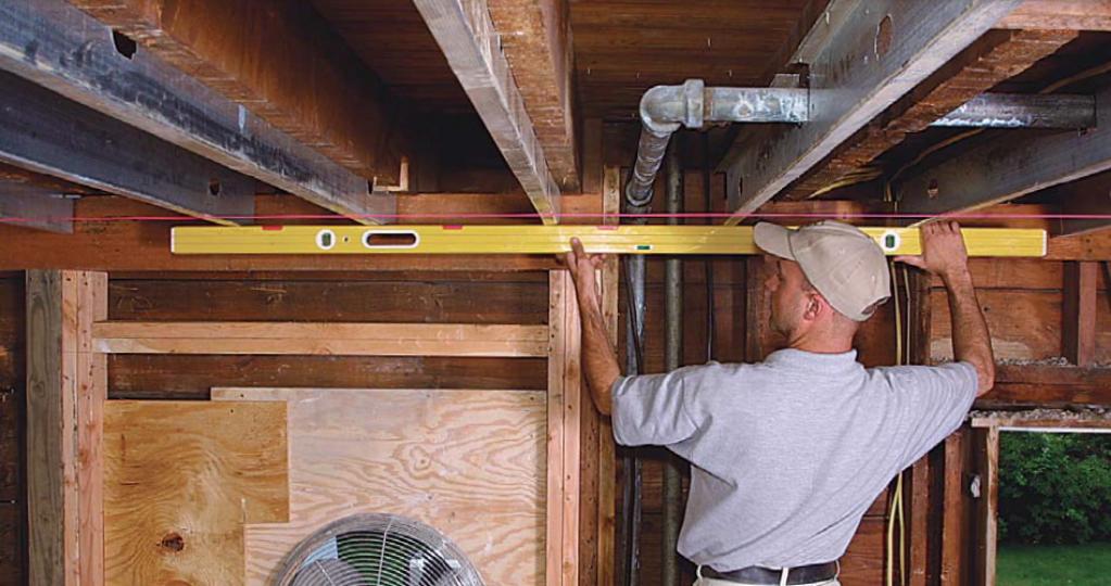 Не у всех в хозяйстве есть оптические нивелиры, особенно показывающие единую проекцию горизонтальной линии одновременно на четырех стенах комнаты. Если нет нивелира, то самую низкую точку на плите перекрытия находят алюминиевым уровнем длиной 200-300 см. Если нет и такого длинного уровня, то делают следующее: встав по центру помещения, визуально определяют самый заниженный участок перекрытия. В этом районе от перекрытия по стене отступают 100 мм и делают отметку. После этого используя водяной уровень (наполненный водой прозрачный шланг), от исходной отметки производят другие отметки на всех четырех стенах помещения.