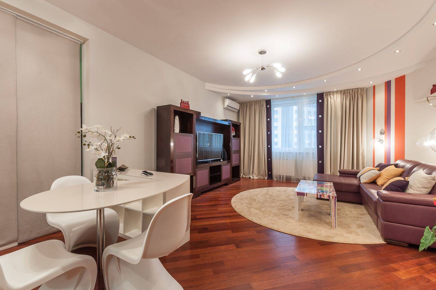 Криволинейные композиции считаются сложными, но пользуются огромной популярностью в дизайне гостиных. На сегодняшний день их можно выполнить в различной отделке. Все зависит от фантазии и умения хозяев дома. Стильно смотрятся узоры с кривыми линиями, плавно приобретающие округлую форму. Что касается верхней пленки, для ее установки подходят глянцевые покрытия и материалы с сатиновой, замшевой поверхностью.