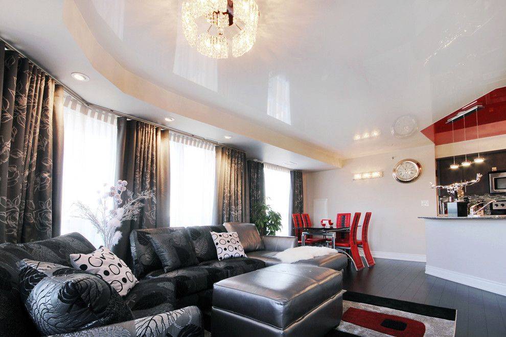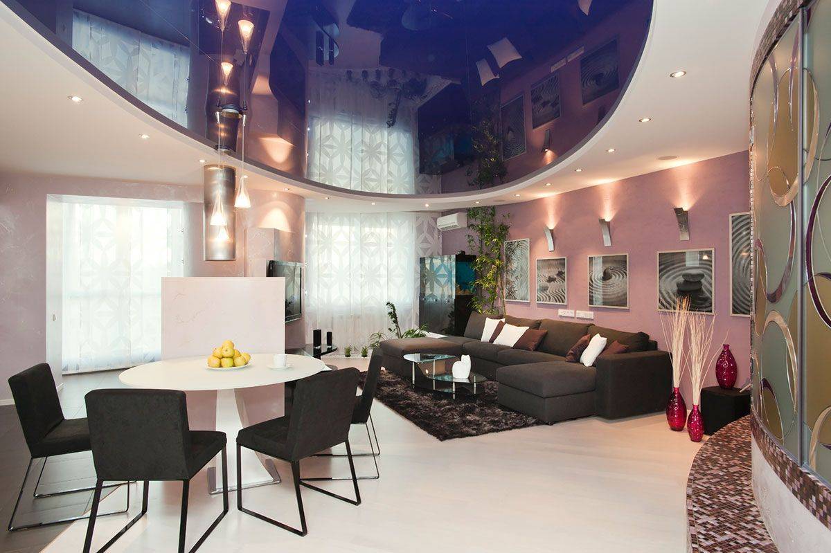 Глянцевый натяжной потолок подходит роскошной гостиной, матовая поверхность стильно смотрится на современной кухнеИсточник stroy-podskazka.ru