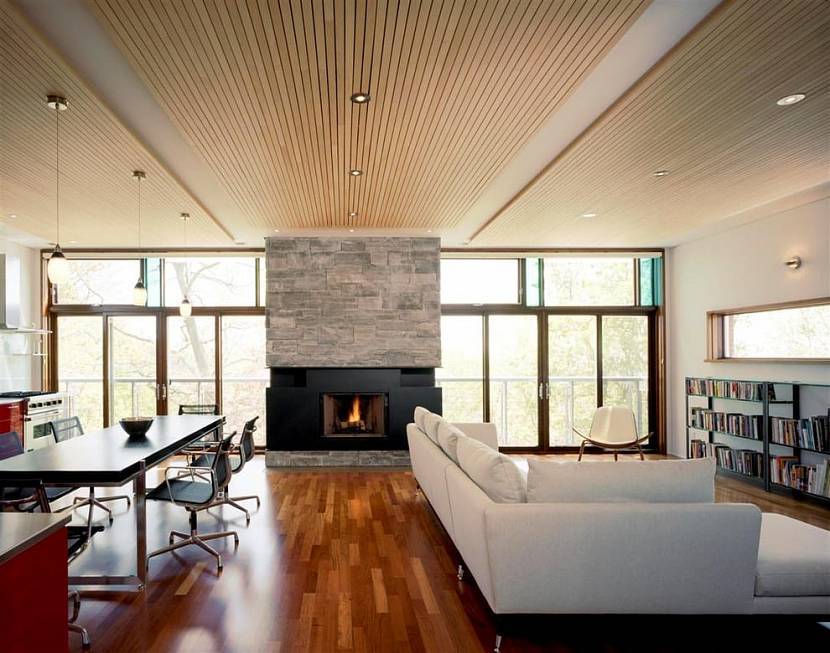 Реечный потолок оригинально смотрится и улучшает звукоизоляциюИсточник akuhnja.com