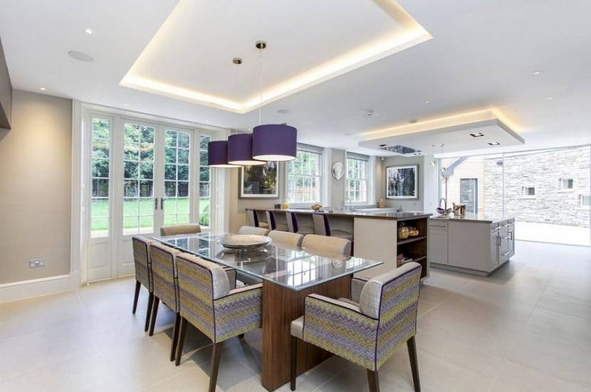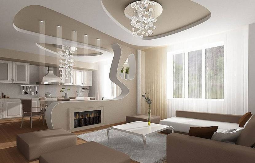 Потолок в кухне-гостиной из гипсокартона может иметь разные формы: от одного до четырех уровней. Одноуровневые конструкции самые простые, достаточно украсить их софитами, и дизайн потолка закончен.
