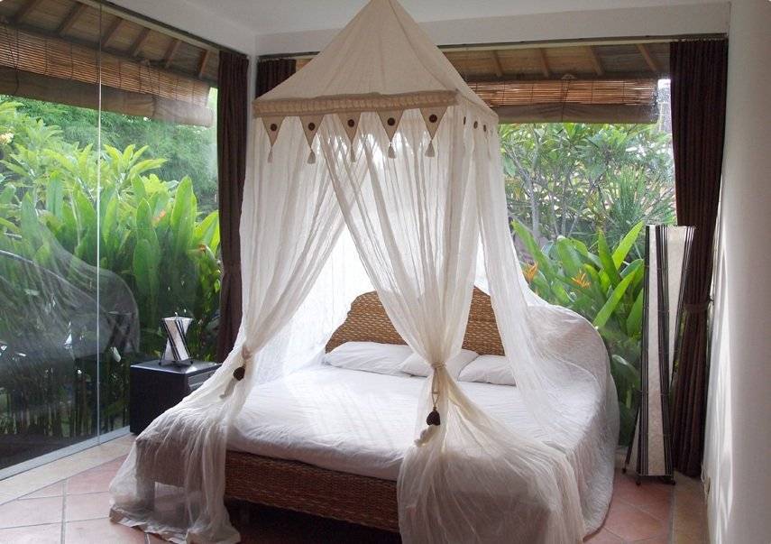 Кстати, о ткани. Чтобы не мешали назойливые мухи и комары, на даче над ложе делают балдахины из мягкой москитной сетки или органзы.