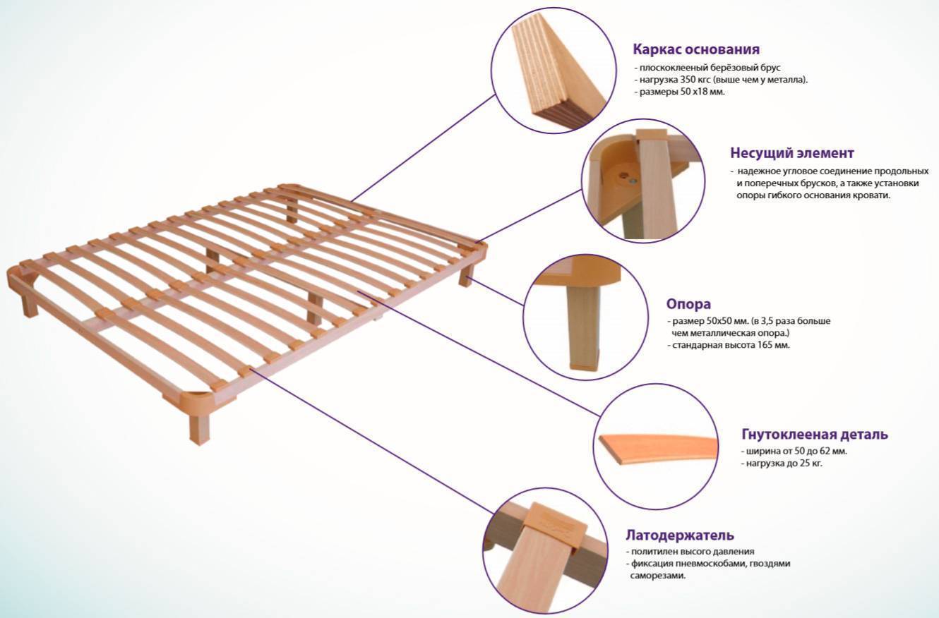 - Ламели. Это основная часть, на которой располагается матрас. Предъявляются особые требования к надежности. Рекомендуется изготавливать ламели из дерева, так как это безопасный, экологически чистый и долговечный материал, выдерживающий большие нагрузки.