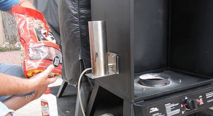 Для того чтобы дым непрерывно поступал через специальное отверстие в шкаф нужен дымогенератор. Следует избегать использования пород дерева с большим содержанием смолы, чтобы не навредить здоровью и не засорить дымоход.