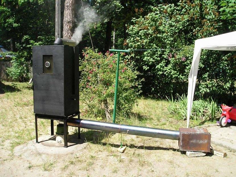 Для понижения температуры дыма трубопровод охлаждают, закапывая в землю или делая водяную «рубашку». Чтобы дым поступал в коптильню, трубу располагают с наклоном в сторону печки
