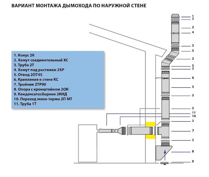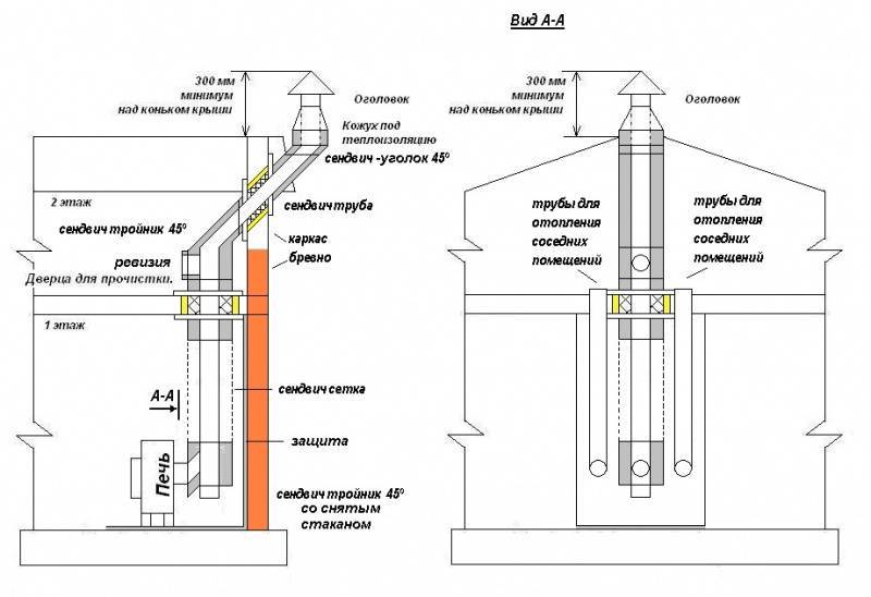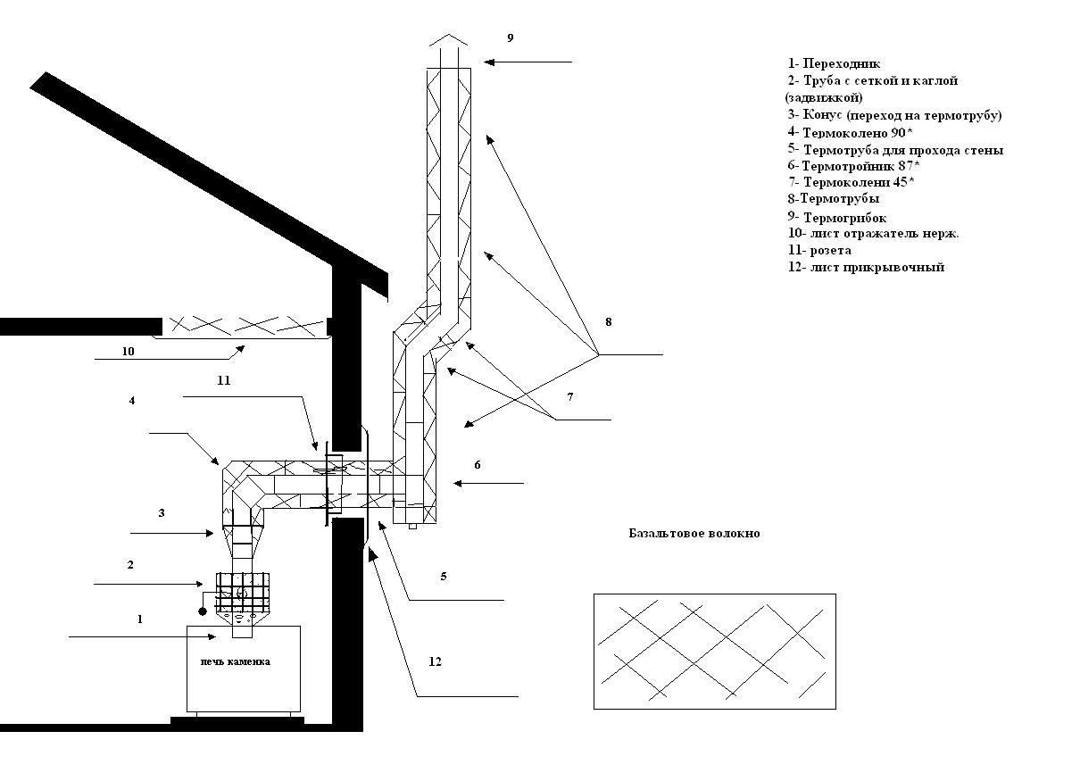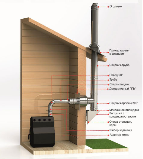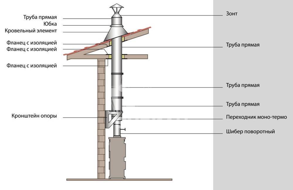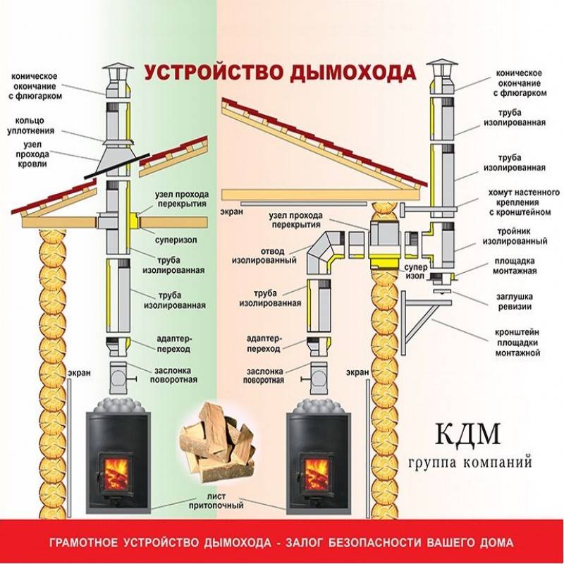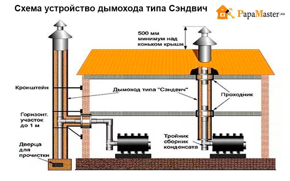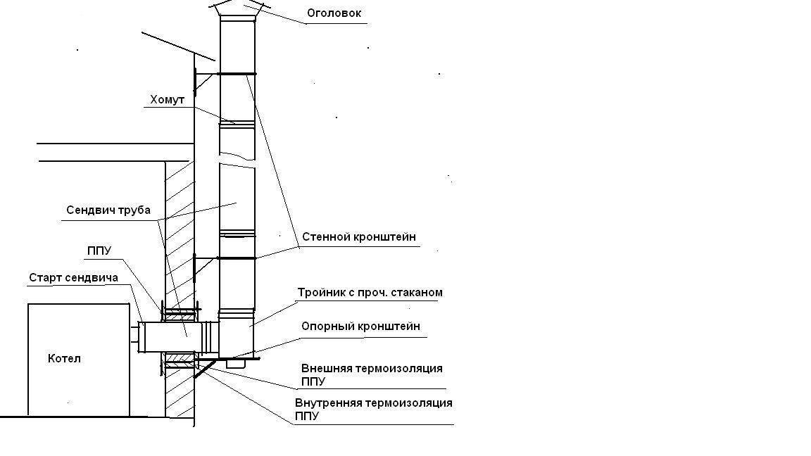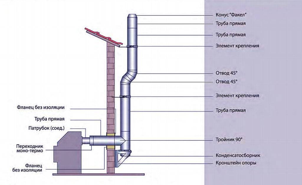 Несмотря на все расчёта, в дымоход газы иногда уходят не полностью догоревшими. Поэтому делать его нужно особенным образом. Дымоход состоит из: