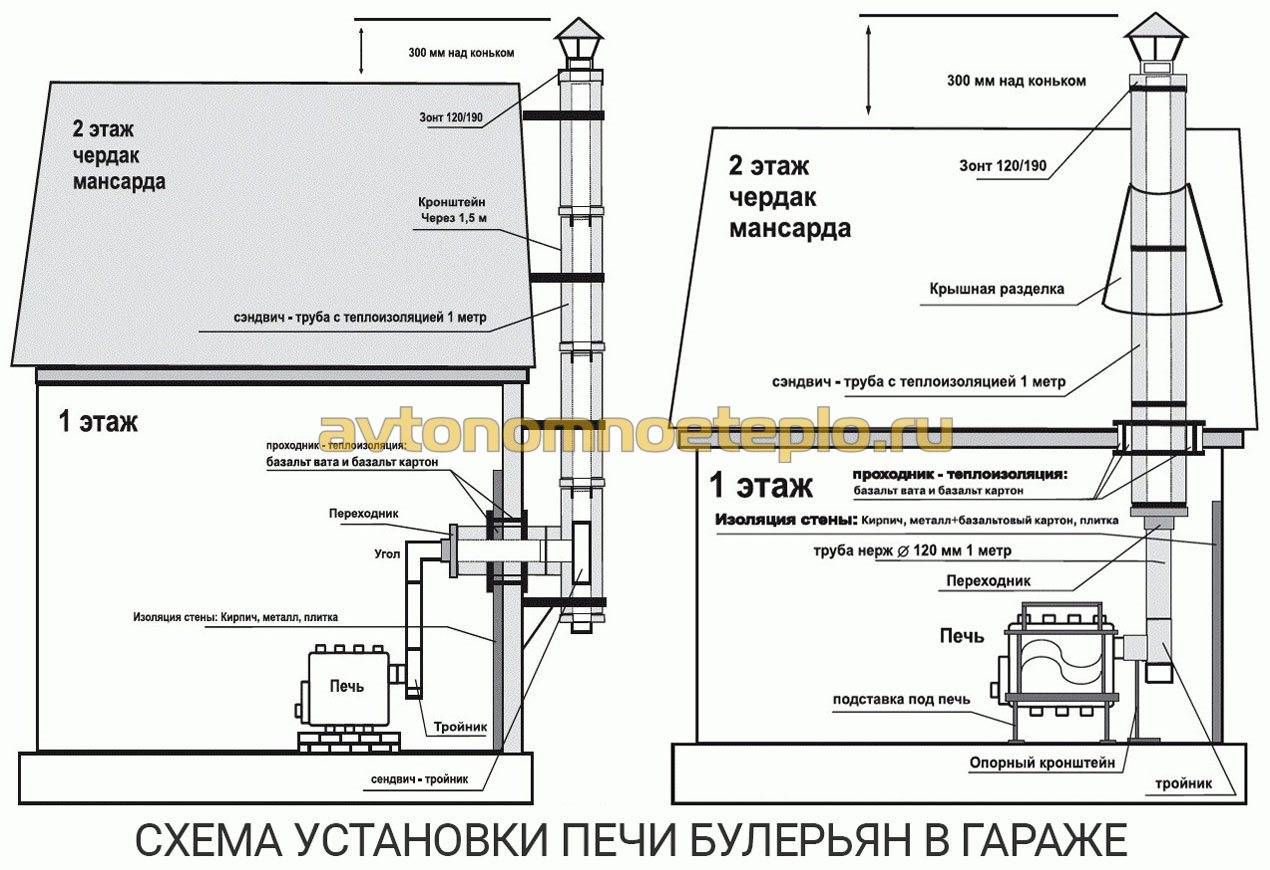Специфика работы буржуек с низким КПД позволяет уменьшить до 3,5—4 м общую высоту трубы, выводимой над плоской кровлей одноэтажного гаража. Зона ветрового подпора отсутствует, поскольку нет конька и скатов, а нагрев отходящих газов до высокой температуры создает достаточную естественную тягу. Как это реализовано в гараже, смотрите на видео:
