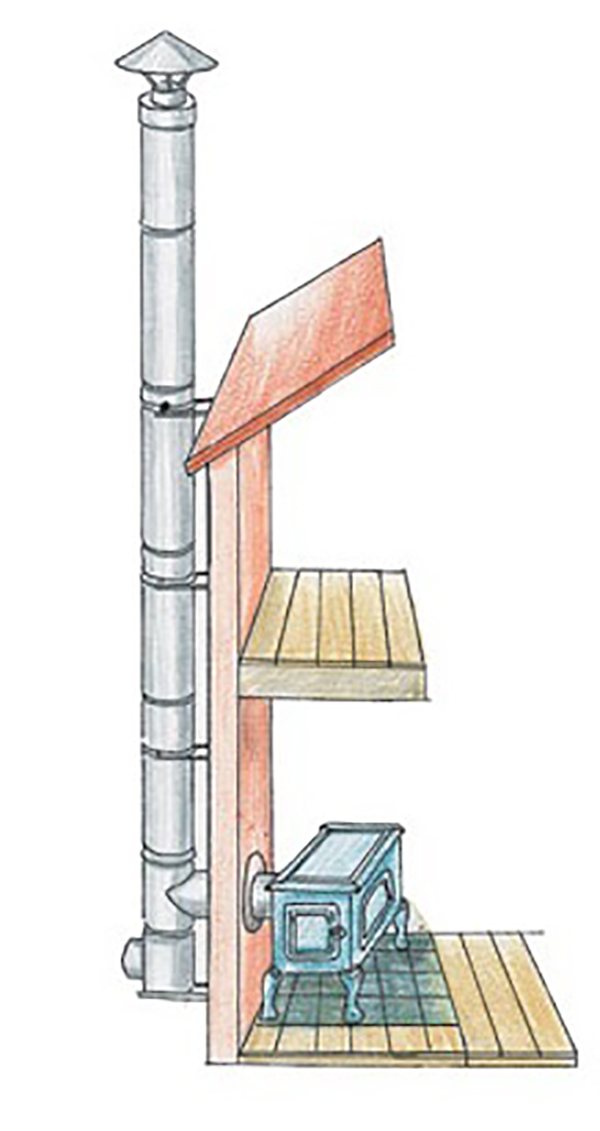 - дымоход не должен проходить над полком — можно случайно сильно обжечься;