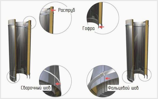 Соединяться между собой детали сэндвич дымоотвода могут двумя вариантами: раструбами и волнистыми краями. Раструбное соединение подразумевает наличие с одной стороны немного более широкой фаски. При подобном выполнении достигается большая степень герметичности дымоотвода. Этот вид сэндвич труб прекрасно подойдет для газовых водогреев, где главное не позволить утечки. Есть и минус: процесс установки просит большой точности.