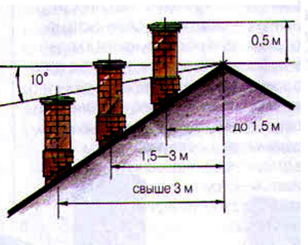 В отдельных случаях труба располагается далее 3 м от линии конька, тогда ее наименьшая высота высчитывается под углом 10 градусов сравнительно к горизонту. На случай, если вблизи расположены большие высотные объекты, а котел или камин работает на дровах, то высота дымоотвода выбирается выше кровли рядом расположенных домов.