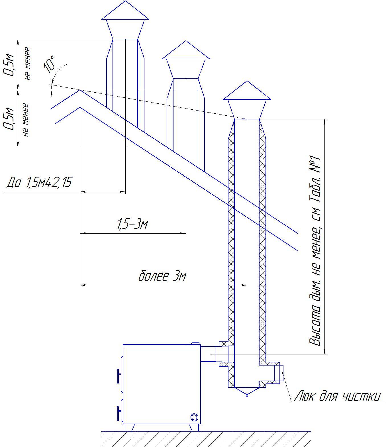 Протяженность дымоходной трубы от колосников до точки выхода обязана быть не меньше 5 м. В случае, если крыша выполнена в виде плоской конструкции, то возвышенность трубы должна быть на уровне не менее 50.0 см. На скатных конструкциях, при месторасположении ее на дистанции от конька до 1.5 м, она должна возвышаться не менее 50.0 см по отношению к крайнему или отгораживающему парапету. В случае если она находится в границах 1.5–3.0 м от конька, то ее вершина не должна быть ниже его либо парапета.