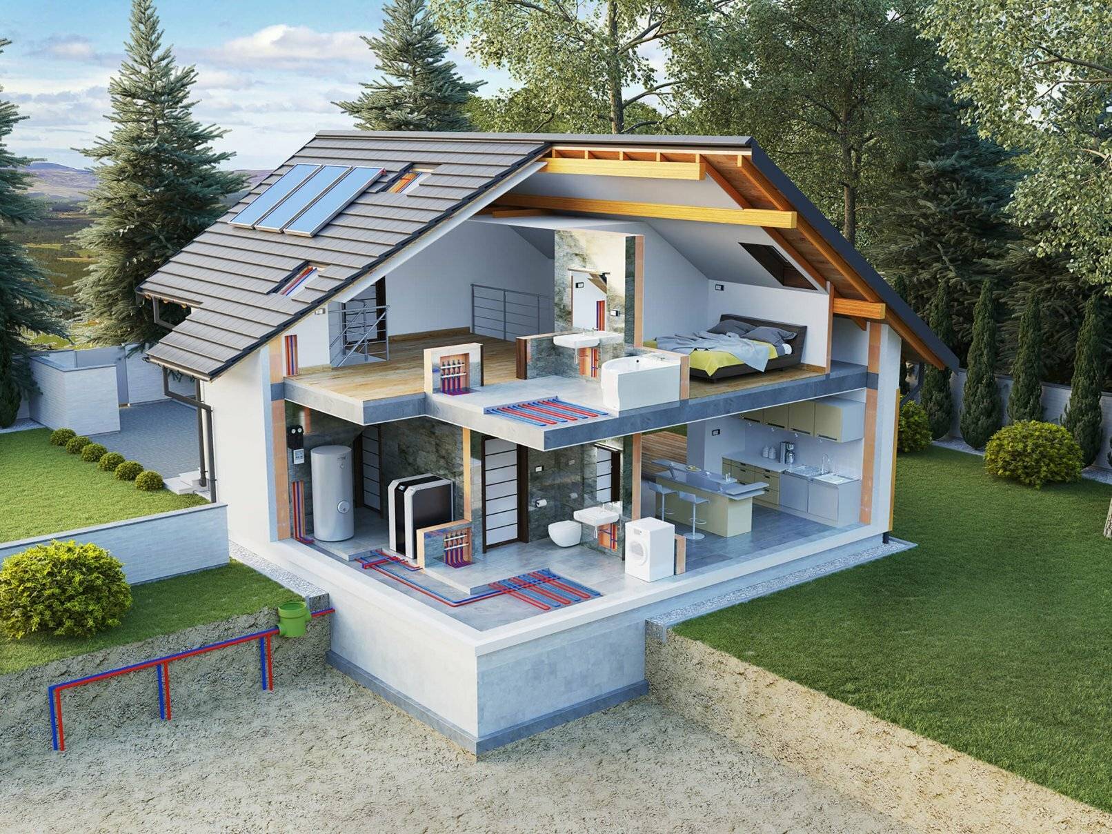 - Электрическая и газовая система отопления частного дома функционирует от внешних источников, хранилища не нужны.