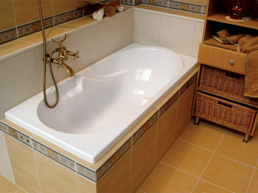 Если у вас советская ванна, видны все старые детали, явно некрасивые, в частности ножки, ржавый слив, то все это «добро» прячется путем создания подиума.