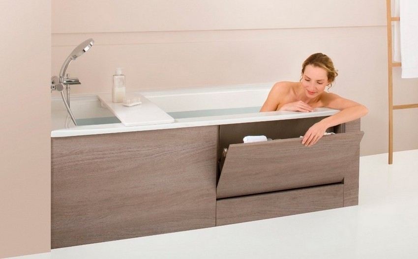Экранное изделие под ванну — это достаточно простая конструкция, занимающая пространство от пола и до кромки сантехнического прибора, располагающаяся сбоку и закрывающая трубопроводные и подводны́е элементы.
