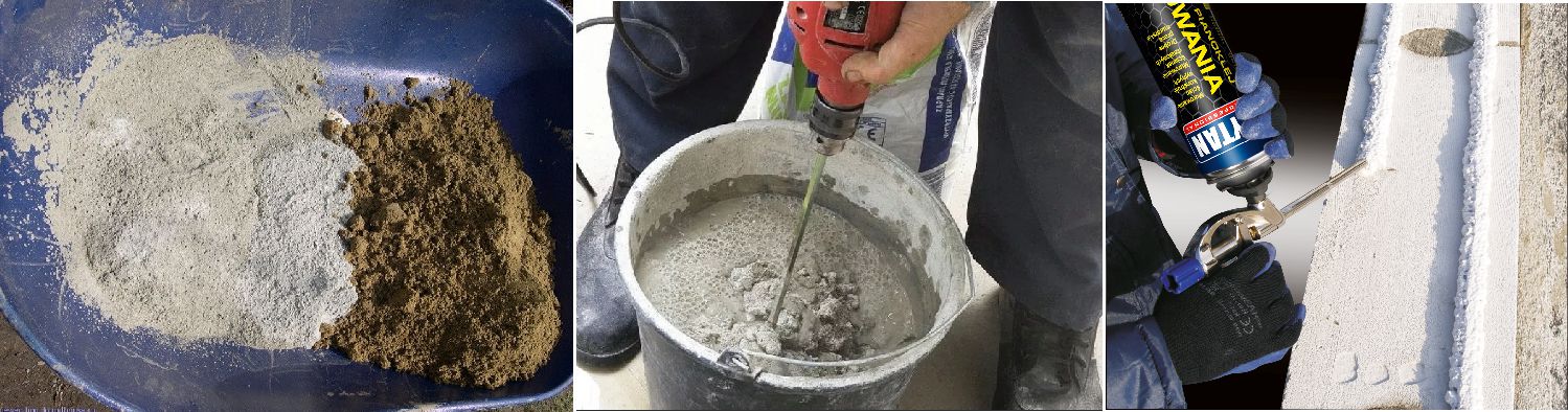 На фото: цементно-песчаный раствор, тонкошовный минеральный клей, полиуретановый клей-пена