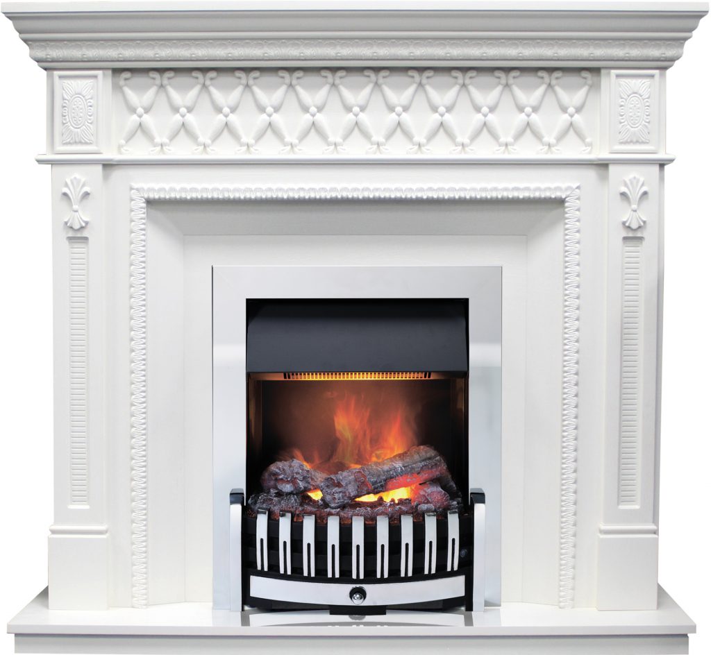 Белые камины или порталы, в которые устанавливается очаг, могут быть различных оттенков белого цвета — вы можете выбрать цвет «слоновая кость» или «белый дуб», также популярны каминные ансамбли с элементами патины, которые добавляют камину налет старины и эксклюзивности.
