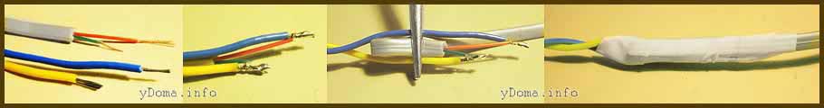 Осталось заправить проводники в оболочку кабеля. Перед заправкой, чтобы было удобнее, можно стянуть проводники витком изолирующей ленты.