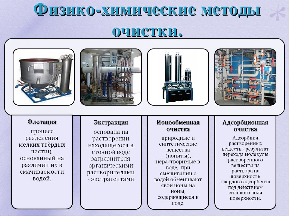 - физико-химические — применяются на промышленных объектах и крупных станциях подготовки воды;