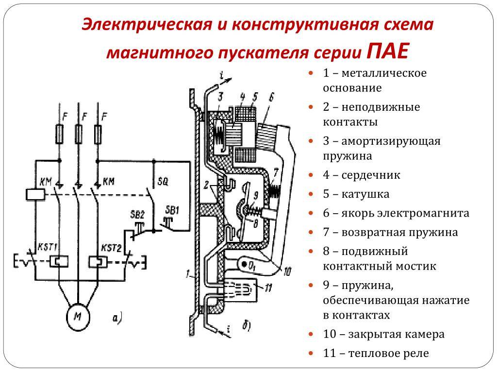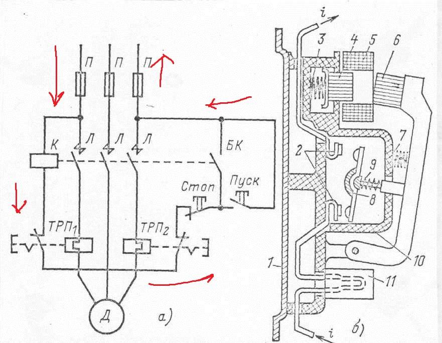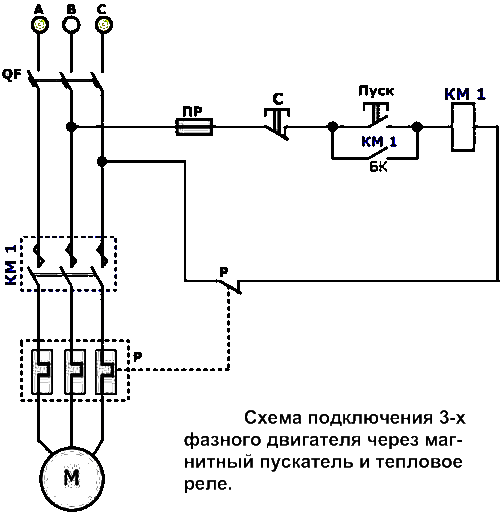 Между магнитным пускателем и устройством двигателя можно пустить тепловое реле, которое может понадобиться для безопасной подачи тока к устройству двигателя.