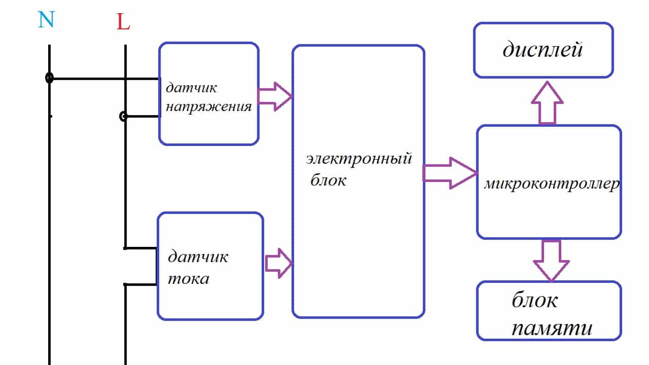 Подсчет электричества производится за счет преобразования сигналов тока и напряжения, «входящих» в прибор, в импульс, который он и подсчитывает.