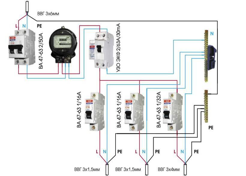 При создании схемы электрического питания, самое главное, это безопасность. Поэтому после счетчика ставится УЗО — устройство защитного отключения. Этот прибор выключает напряжение, если ток утечки превышает номинальное значение. Т.е. он защищает человека от поражения электрическим током.