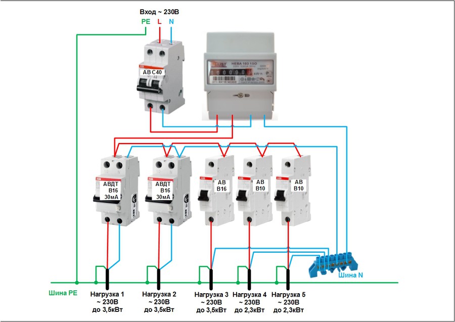 Поэтому собственники стараются при заселении в квартиру изменить его местоположение, чтобы он был эстетичен. При этом не занимал полезной площади и отвечал всем требованиям безопасности. Можно оставить его на прежнем месте, заменив устройства защиты и проверив качество подводки электропроводов. Придется установить новые автоматы, номиналы которых соответствуют мощности оборудования собственника. Например, как показано на нижеприведенном рисунке.