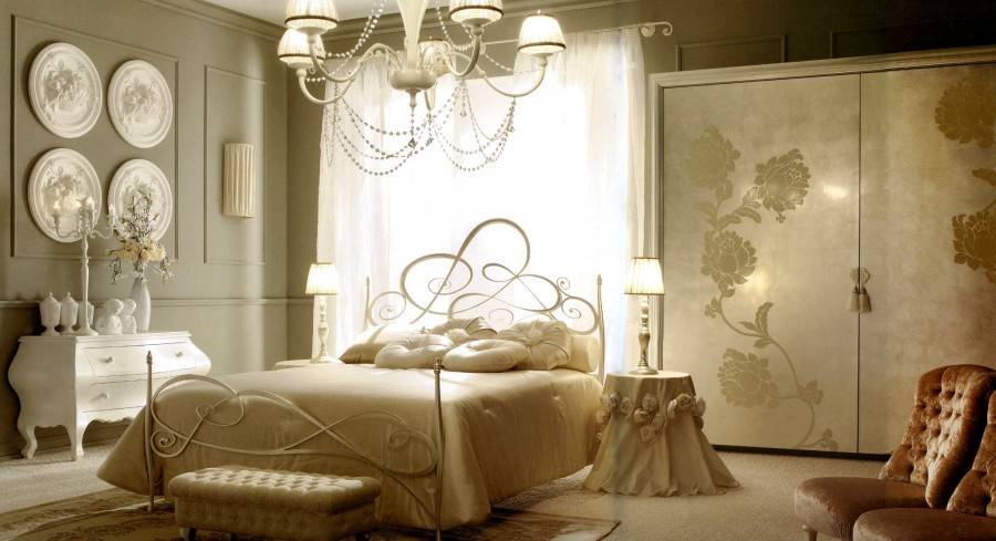 Если помещение не очень просторное и без окон, можно расширить пространство использованием зеркал в рамах под старину и большим количеством света. Комбинируя орнамент на тумбочках и в самой отделке, можно добиться ощущения целостности и роскоши. С помощью игры света, использования люстр и местного освещения можно создавать интимную подсветку в зоне отдыха.