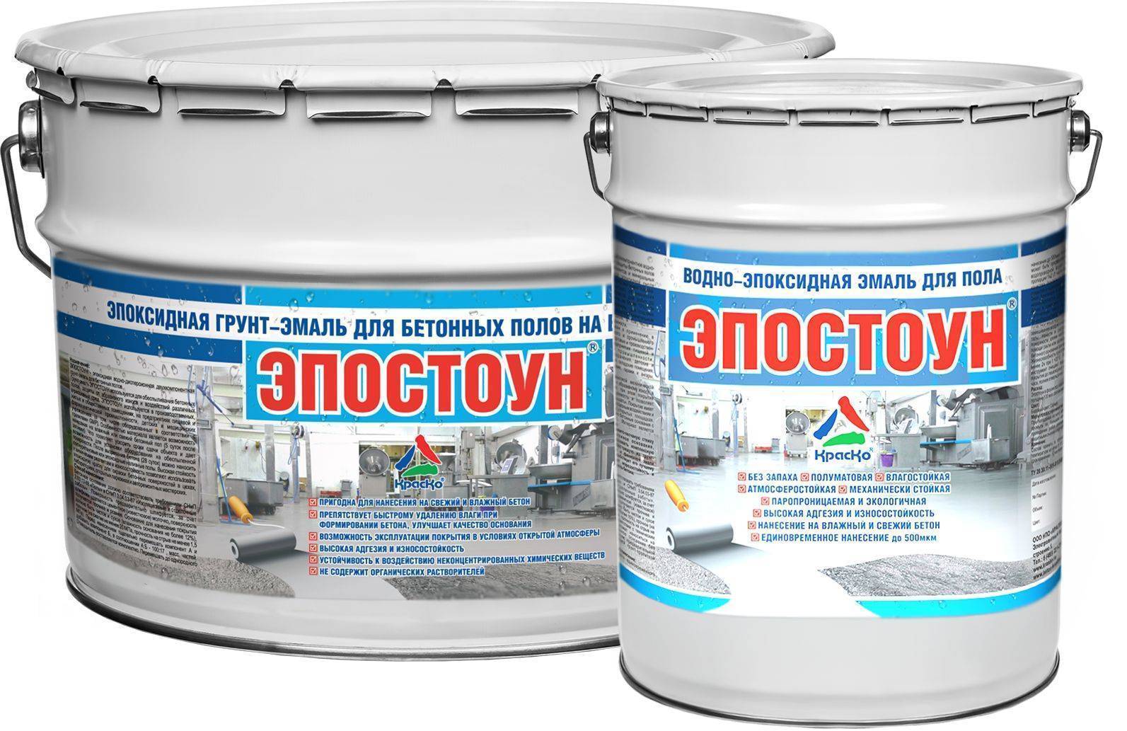 Среди компонентов этого красящего вещества – эпоксидные смолы и отвердители. Ее используют, как для отделки внутренних помещений, так и наружных поверхностей.