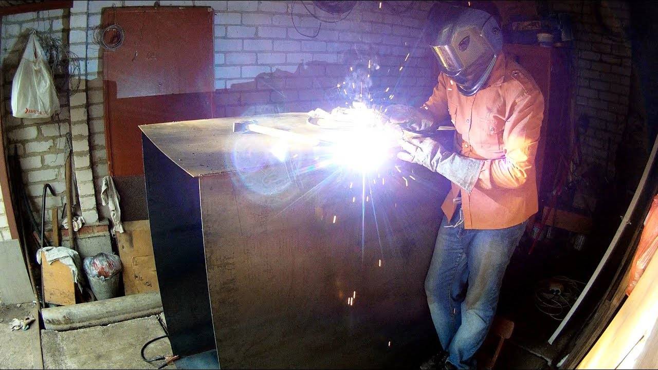 Лучше проводить работу с напарником. Один будет варить, а другой — держать заготовки под нужным углом. Также рекомендуем подложить под будущее дно кирпичи или доски, чтобы плоскость была ровной.