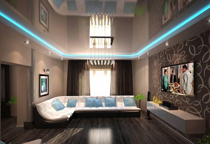Для гостиной подбираются оригинальные и необычные дизайнерские решения. Элементы потолка делают контрастными ко всему дизайну помещения, подсвечивая их светильниками того же цвета. Для создания объема подсветка устанавливается по периметру с внешней стороны. Оригинально выглядят потолки с использованием геометрических фигур.