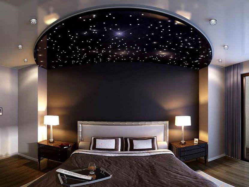 - Точечная. Источники света устанавливаются по-отдельности, создавая имитацию звёздного неба. Для них в полотне делают специальные отверстия, это достаточно сложный и длительный процесс. Лучи света направляются от потолочной поверхности к полу или стенам.