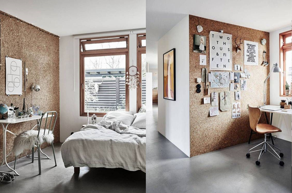 Пробковая отделка стен не требует тщательной подготовки поверхности и неплохо скрывает неровности. Используется, как правило, для выделения одной акцентной стены в помещении. Удобно для детской и домашнего офиса.