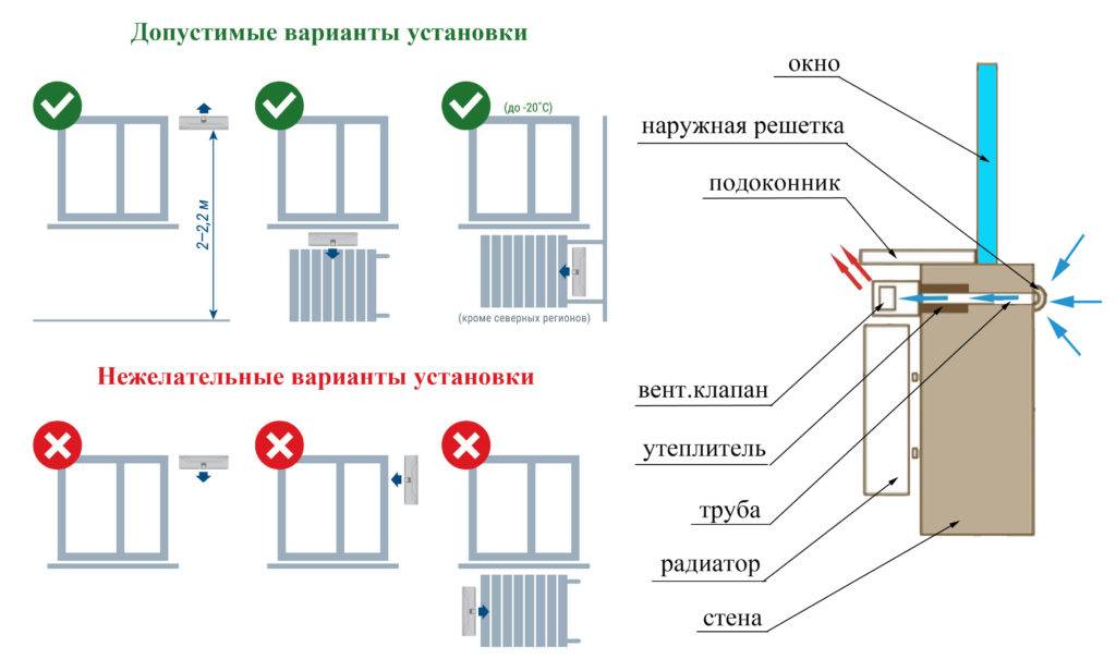 Приточный вентиляционный клапан без функции подогрева воздуха лучше всего смонтировать над батареей отопления. Таким образом холодный воздух, поступая в комнату, будет смешиваться с теплым воздухом, который подымается от батареи отопления, и, следовательно, нагреваться.