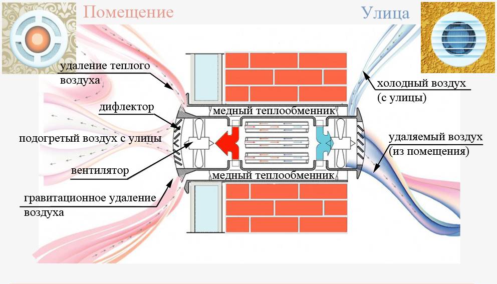- воздух с улицы, по приточному воздуховоду, попадает в рекуператор;