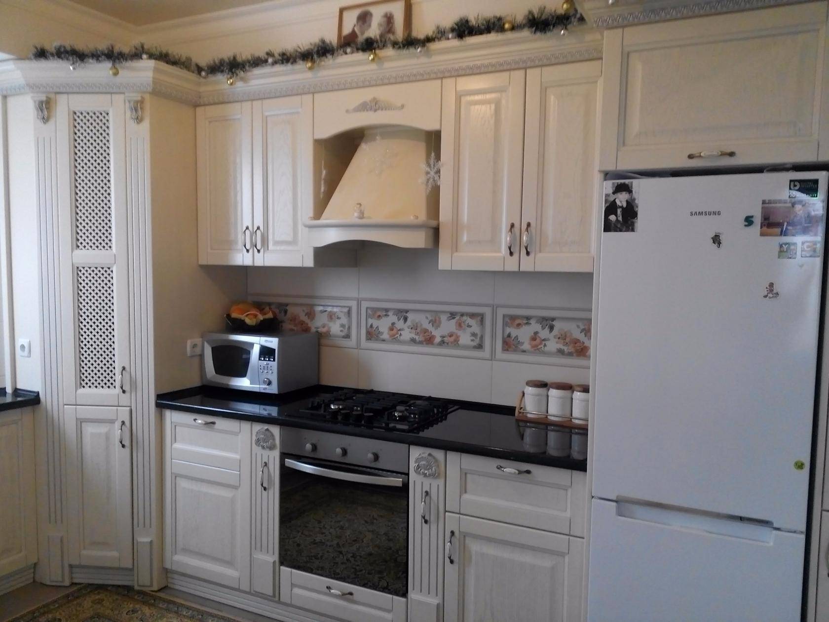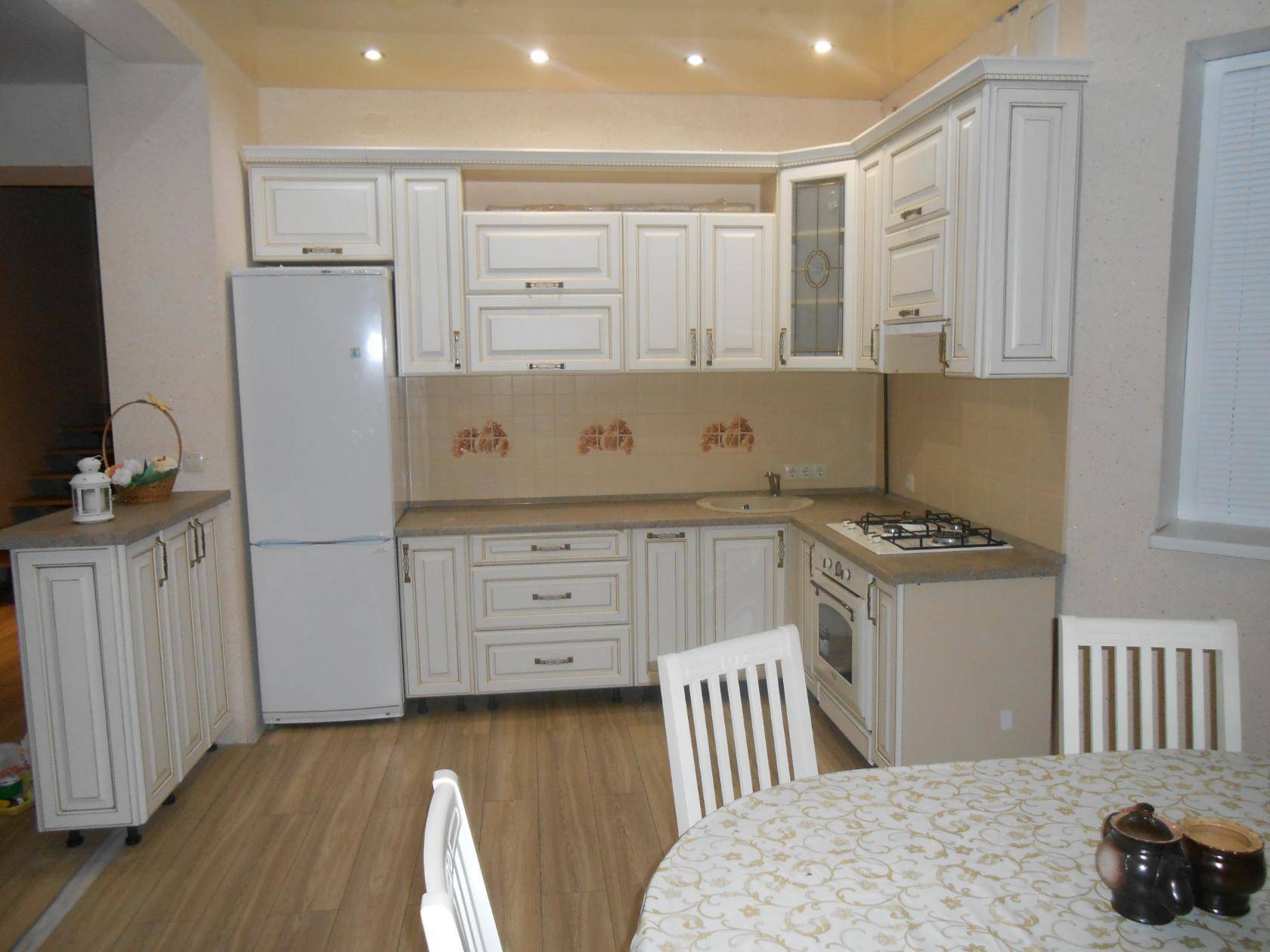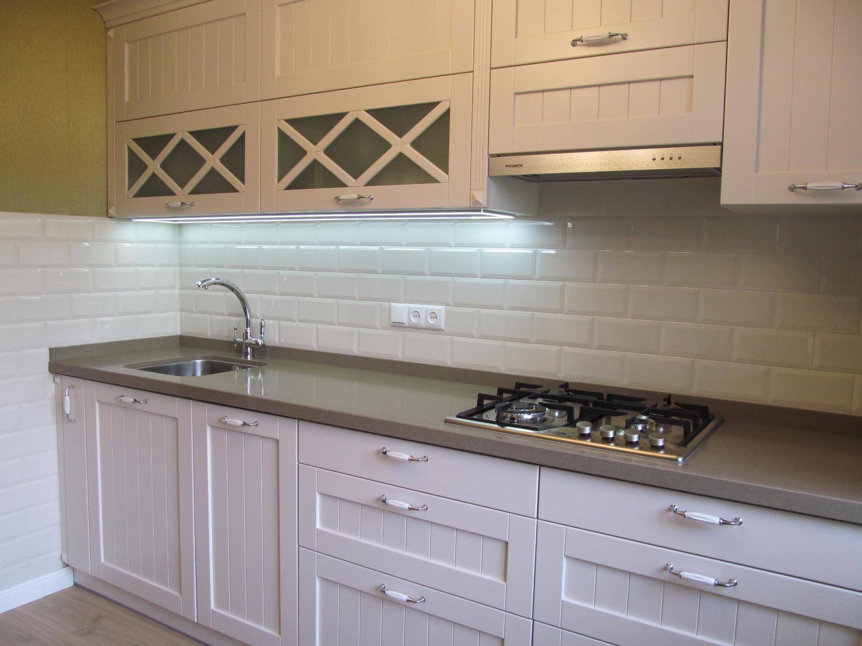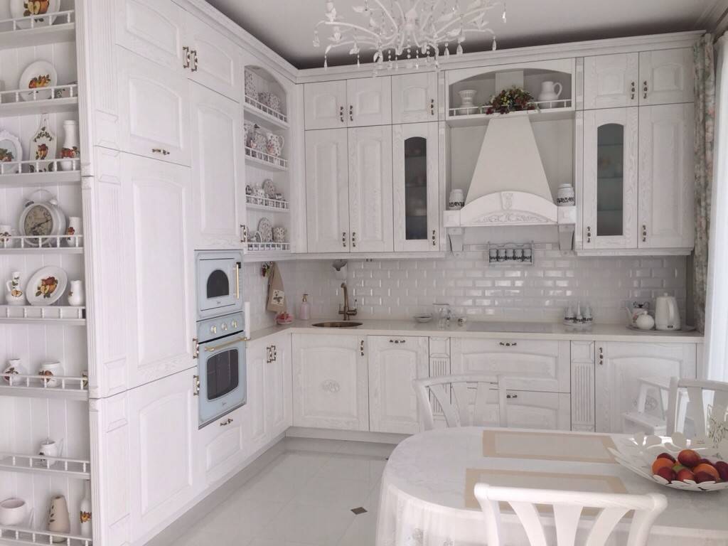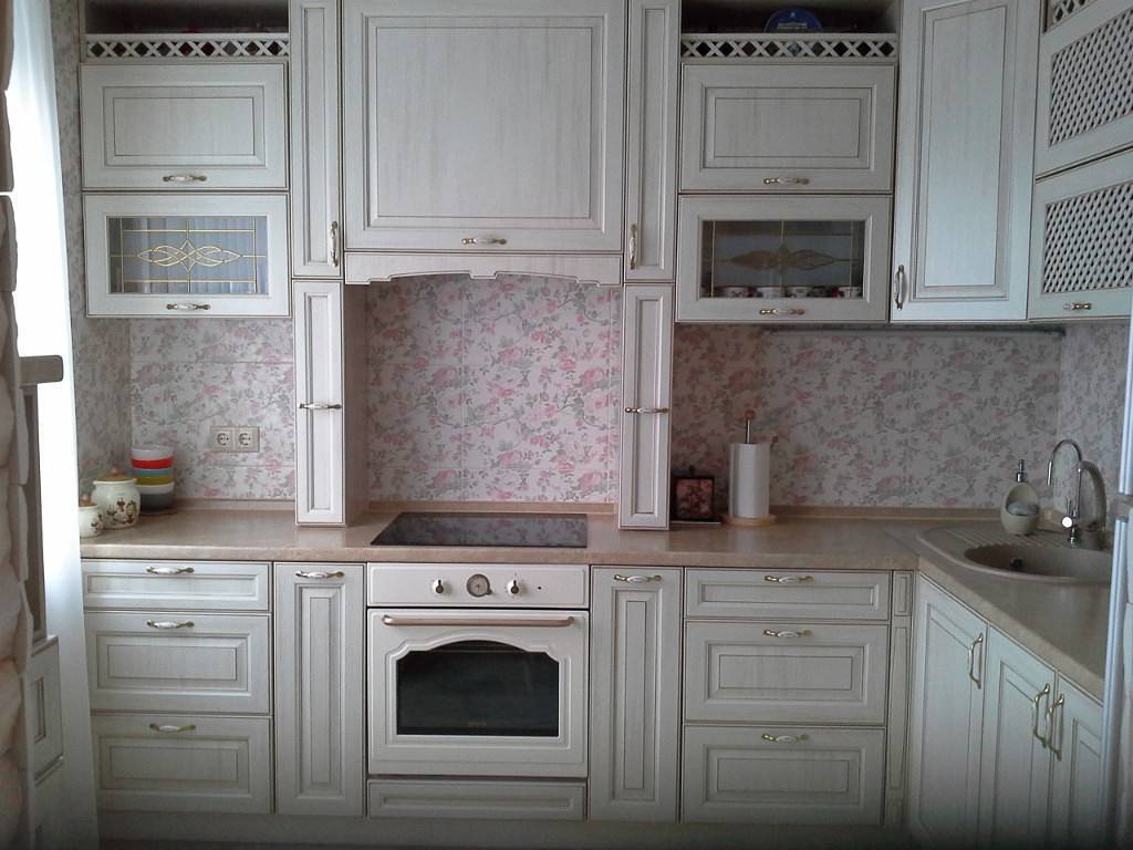 Немного разбавить стерильность основного цвета может пол и столешница в тон пола. Стены часто окрашиваются обычной краской или наклеиваются светлые обои с орнаментом.
