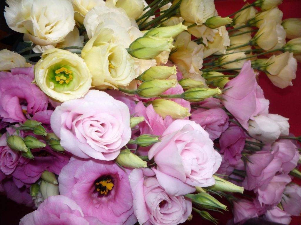 Цветки эустомы могут быть простыми, полумахровыми или махровыми, внешне похожими на колокольчики, маки, розы или лилейники. Средняя величина цветов в поперечнике составляет 5-8 сантиметров. Форма и окраска цветов лизиантуса обычно зависят от видовых/сортовых особенностей растения. Палитра окрасок включает в себя кремово-белые, персиково-розовые, лавандово-сиреневые, фиолетово-лиловые, золотисто-бежевые и многие другие тона. Окраска цветков может быть как однотонной, так и пестрой.