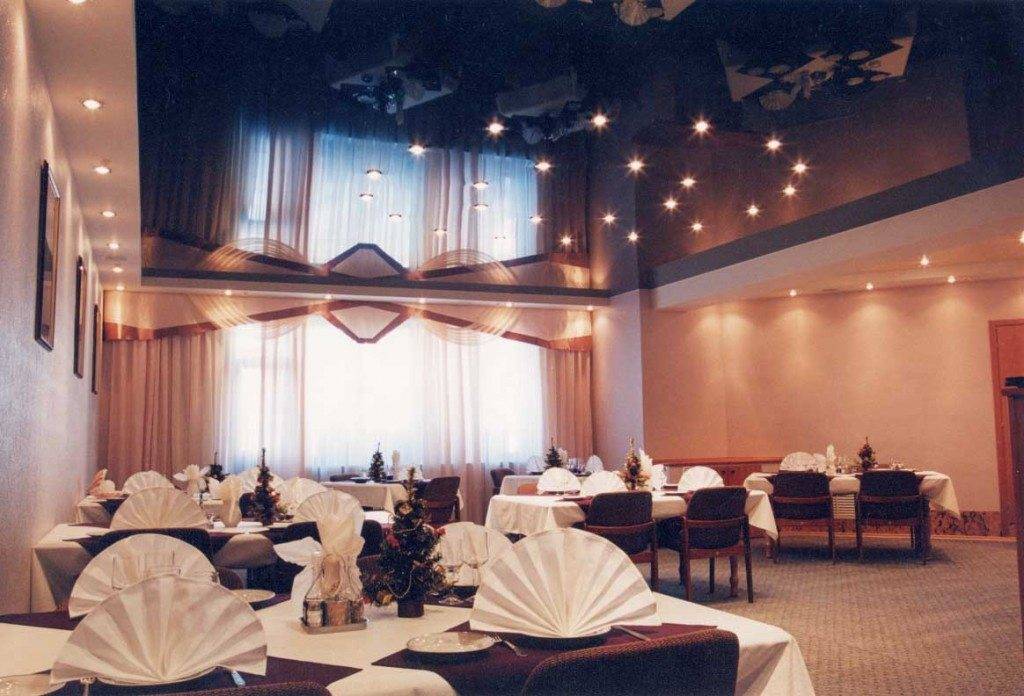Если помещение, наоборот, габаритное, то здесь в самый раз использовать темные глянцевые натяжные потолки – палитра может быть абсолютно любой под стать интерьеру – от темно-зеленых и синих оттенков до коричневых и черных (см. Белый глянцевый натяжной потолок: главные преимущества и способы монтажа). Темный глянец позволит сгладить дисбаланс между обычной высотой потолков и большой площадью помещения. Также тут можно поэкспериментировать с теплыми яркими тонами – желтым, оранжевым, красным и т.д., что придаст помещению уюта и бодрости.