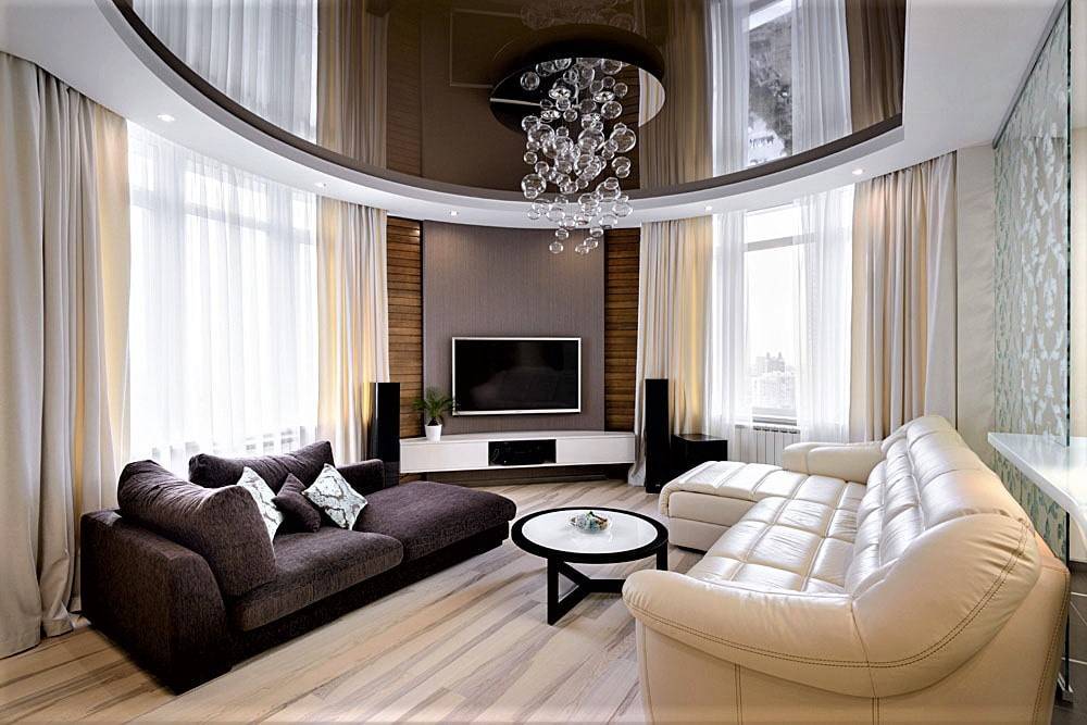 Многообразие расцветок двухуровневых полотен позволит выполнить разные сочетания и применить современные дизайнерские приемы. Можно поддержать цвет стен, мебели или штор в гостиной и задать тон в интерьере.