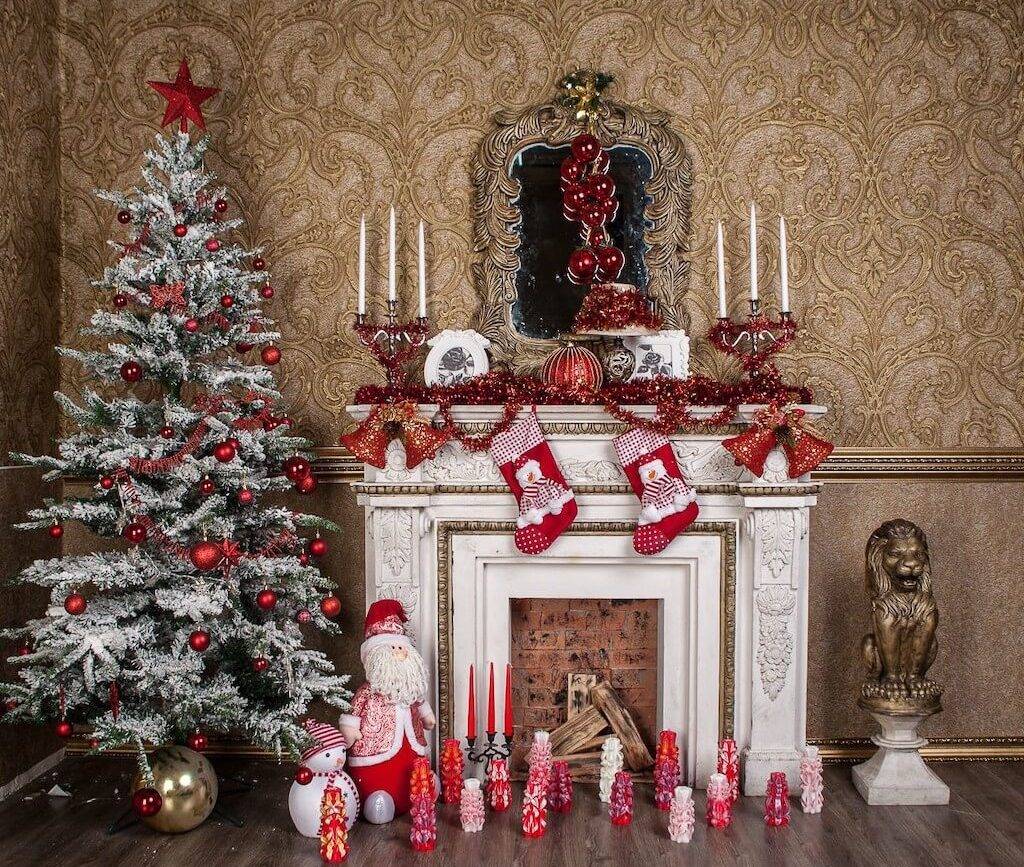 На фото ниже: узор лепнины на камине повторяет рисунок на обоях, добавляют единства стилю, созвучно подобранные молдинги. Довершает образ — игра цвета. Красный и белый являются одновременно — контрастными к основному интерьеру, и в то же время — связующими для всего новогоднего декора.