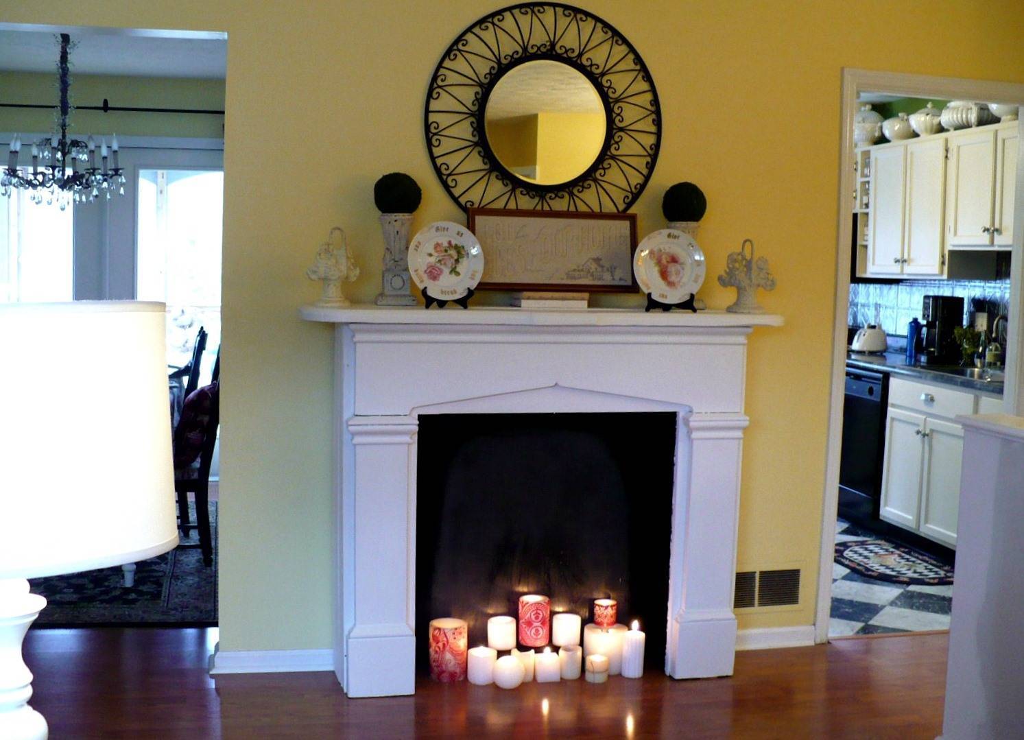 Топку фальшкамина можно оформить по-разному. Некоторым нравится создавать здесь декорации, заполняя пространство еловыми ветками, камнями, шишками или настоящими поленьями. Можно заполнить пространство очага большими красивыми свечами, а на полке камина разместить старинный канделябр.