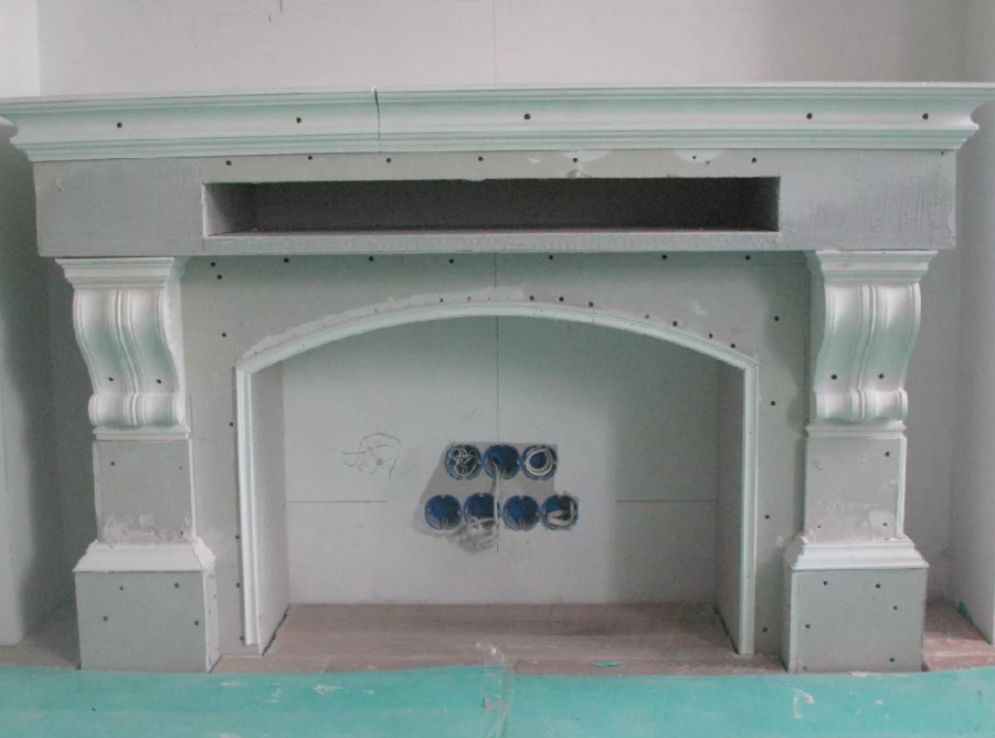 При вырезании фигур края деталей обрезаются под углом 45°, торец должен составлять 5 мм. Такие края станут стыками, на которые клеится армированная лента. После изготовления всех деталей конструкция должна быть обработана грунтовкой двойным слоем. Второй слой грунтовки наносится после высыхания первого. Чтобы добиться аккуратного вида, места креплений замазываются шпаклевкой. Когда шпаклевка полностью высохнет, при хорошем освещении пылинки и неровности убираются с помощью наждачки. Заключительным этапом следует смести всю пыль и нанести дополнительный слой грунта. После покраски камин готов.
