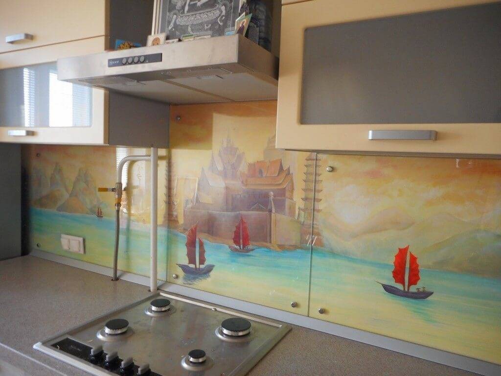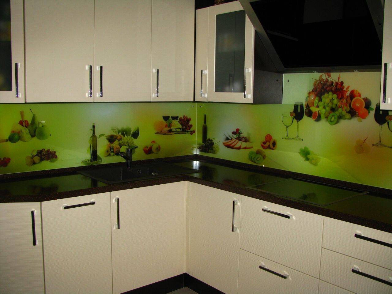стеклянные панели на кухню с рисунком на виниловой пленке. В отличие от фотопечати, этот способ не отличается долговечностью. Декоративную пленку наклеивают на обратную сторону стекла, которое в данном случае выступает защитой от загрязнений и влаги. Однако, в процессе эксплуатации, пленка нередко деформируется, хотя нельзя не признать, что фото фартука из стекла на кухню, отлично демонстрируют привлекательность этого варианта;
