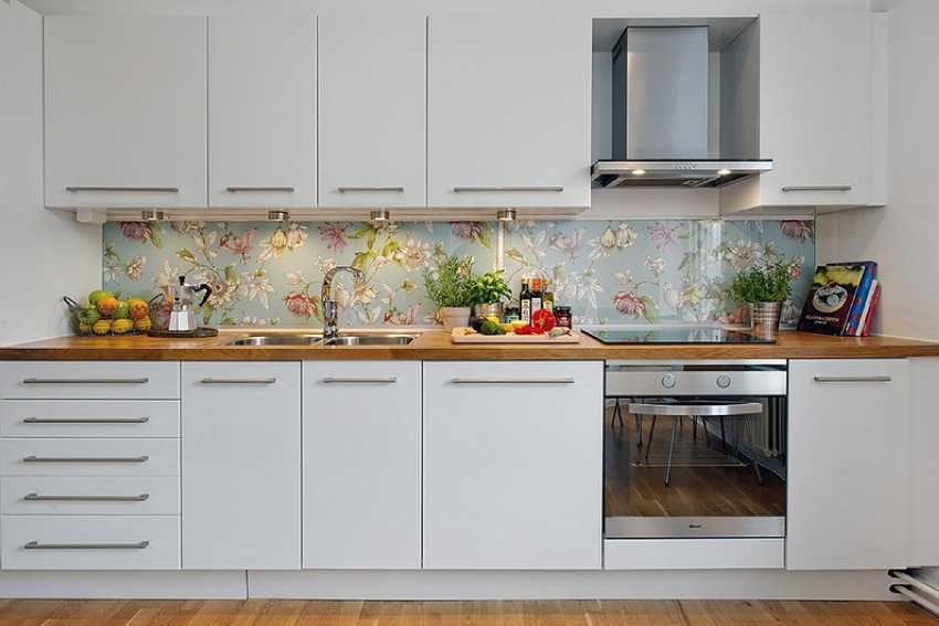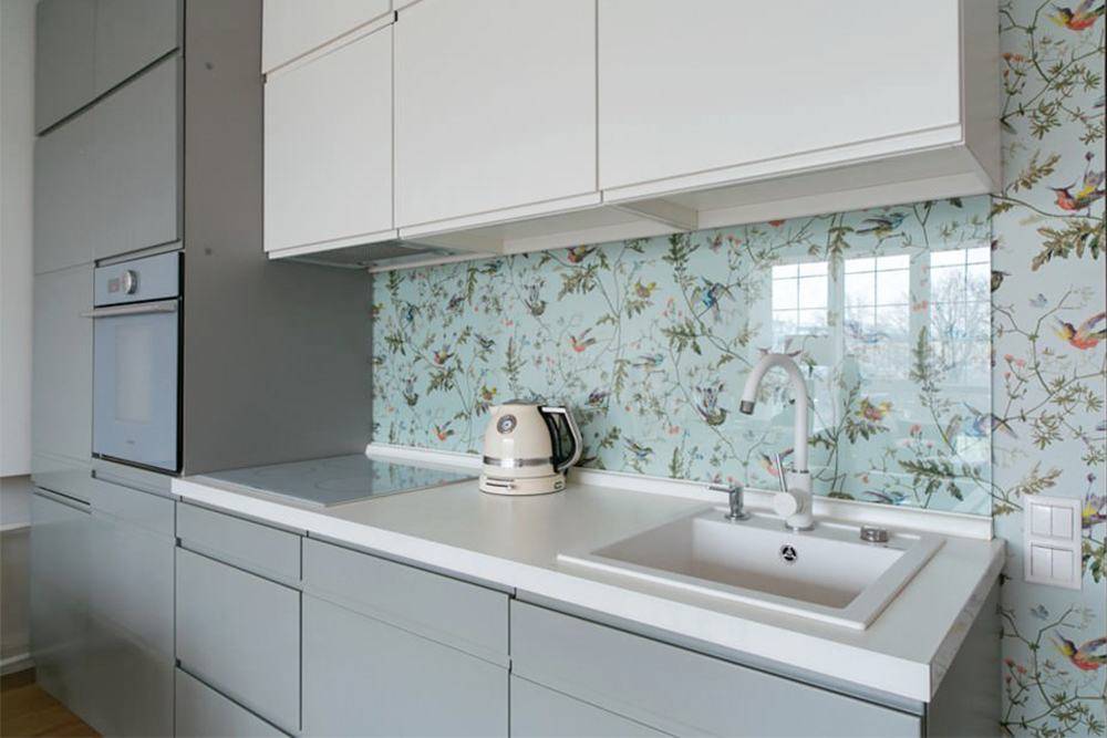 Часто стеклом закрывают обои или покрашенные стены, чтобы не перегружать интерьер кухни разнородными поверхностями.