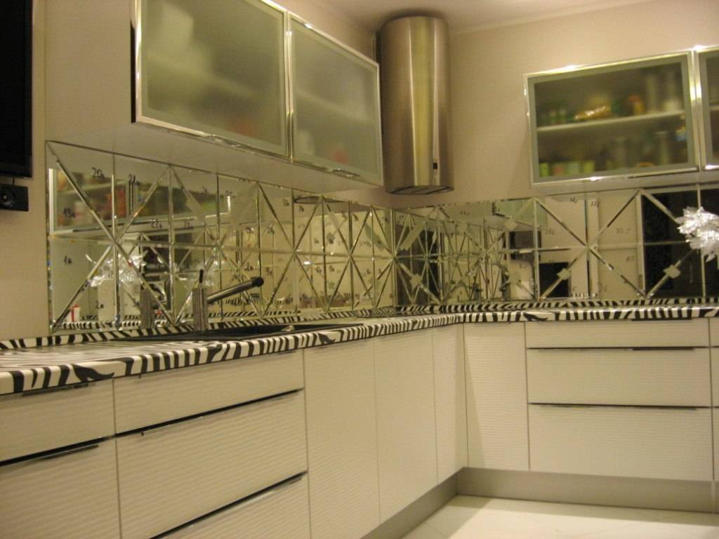 Зеркальное покрытие имеет важный эффект — оно в состоянии визуально существенно расширить пространство кухни. Однако, как показывает практика, чаще устанавливают не цельные панели с зеркальным покрытием, а фартуки с нанесенным рисунком или же монтируют облицовку из отдельных зеркальных плиток.