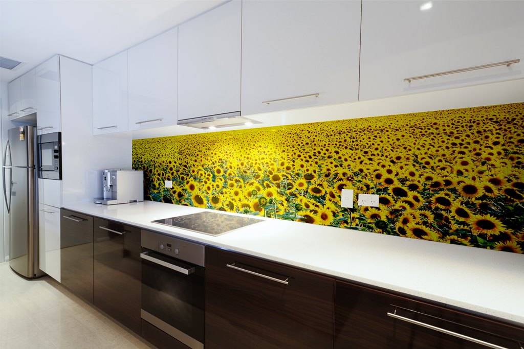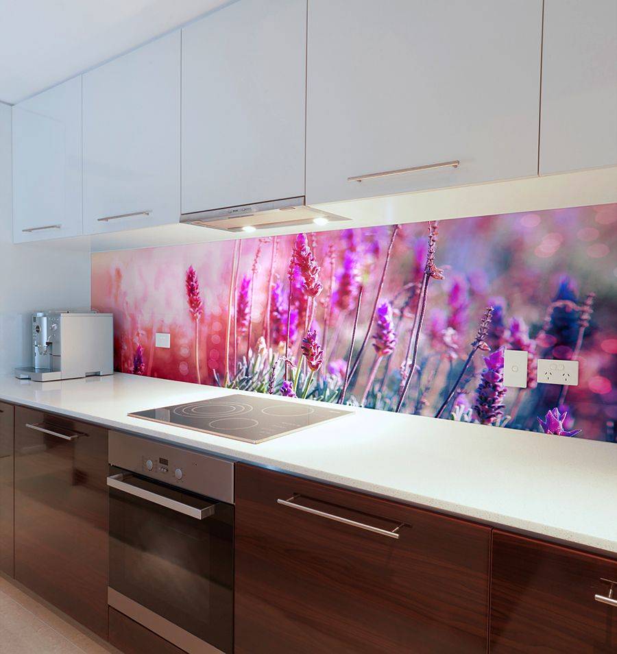 Панель на кухню с рисунком на виниловой пленке — более бюджетный вариант, но наклеенный на стекло узор со временем может выгорать и отслаиваться.
