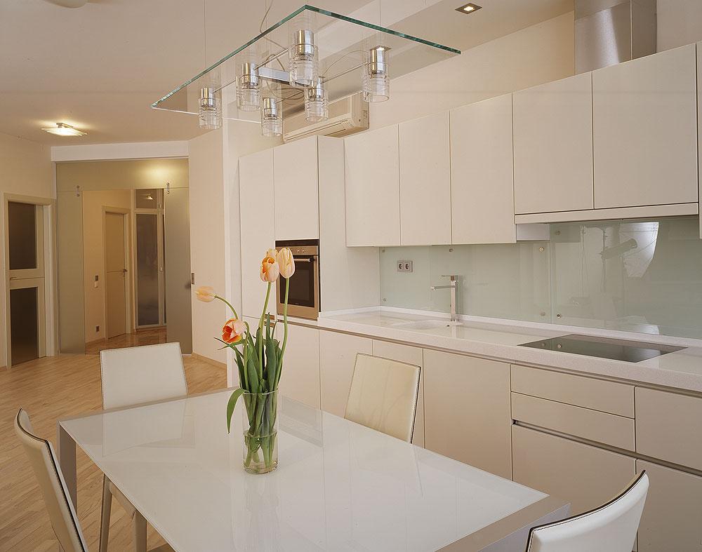Не только для прозрачных скинали, но и для дизайнерских фартуков рекомендуется использовать не простое стекло, которое обычно имеет малозаметный оттенок, а специальный материал — Optiwhite. Это стекло осветляется, в результате чего исключаются искажения и посторонние тона.