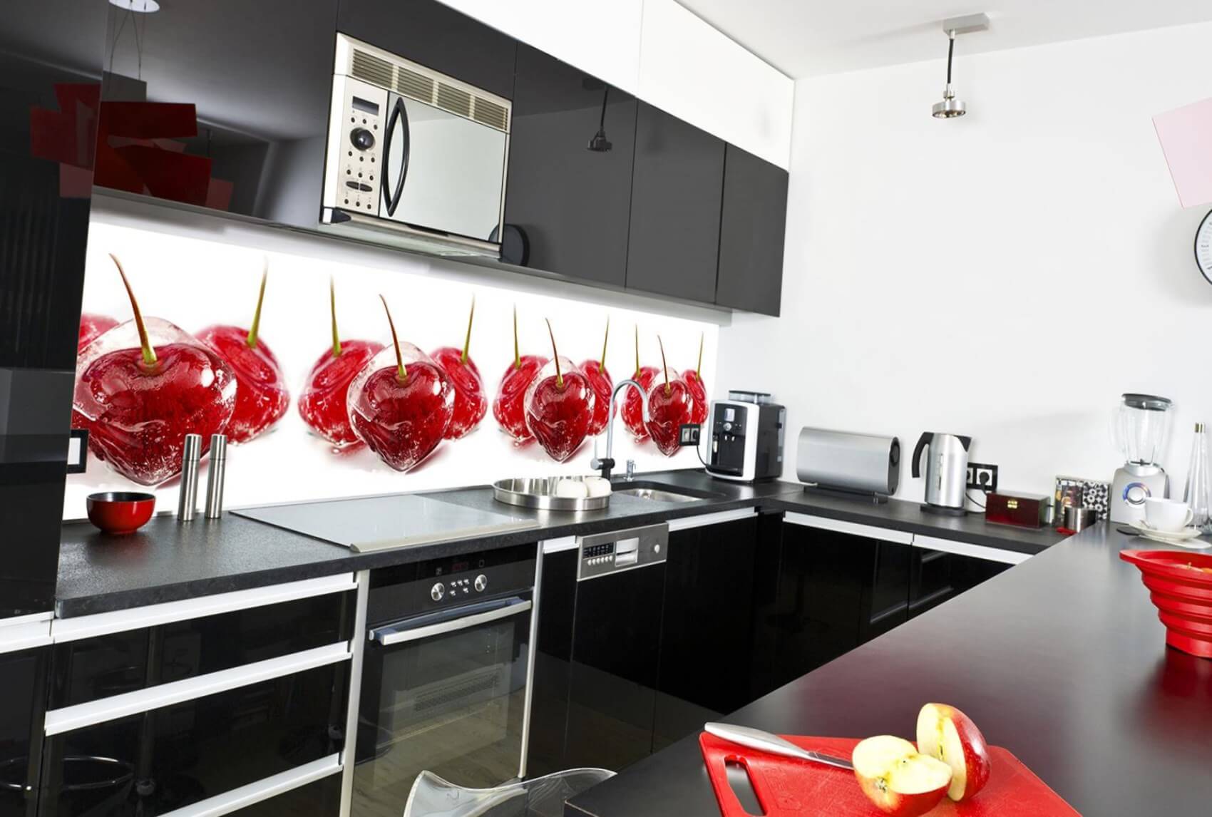 Стильная панель красного цвета способна создать необычный эффект контраста при грамотном комбинировании с бело-черной мебелью кухни.
