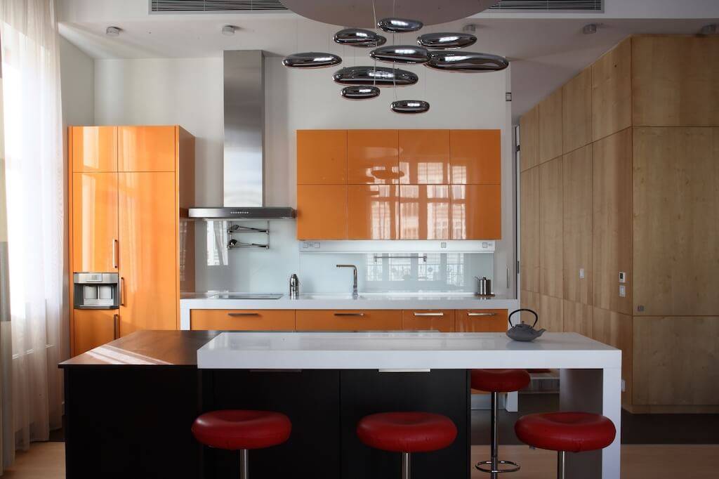 Например, для черно-белого современного гарнитура хорошо подойдут насыщенные оранжевый и желтый оттенки. Если хотите добавить контраста – попробуйте синий и красный.