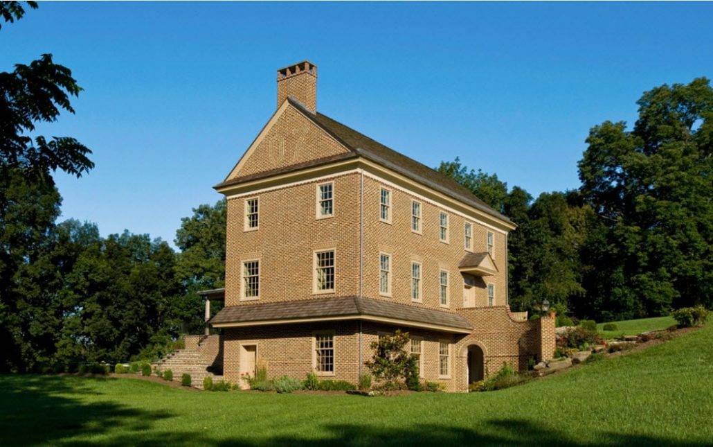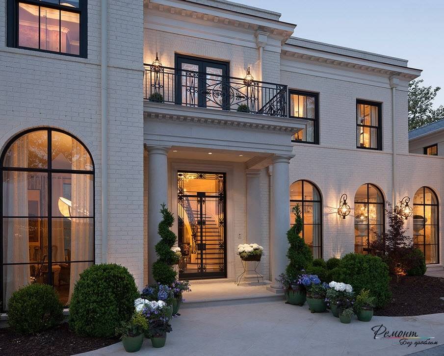 - Особняк в романтическом стиле в светлых тонах, украшенный кованой решеткой под окнами.