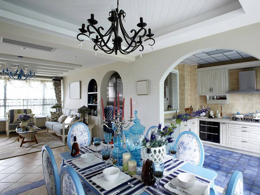 Кухня в средиземноморском интерьере радует особым уютом. Яркие цвета, плетеная мебель и открытые шкафчики с глиняной посудой наполняют помещение особой атмосферой тепла. Рабочую стену на кухне можно задекорировать мозаикой или выложить на ней композицию из фруктов или этническим изображением. Напольное покрытие лучше всего выбирать под натуральный камень.